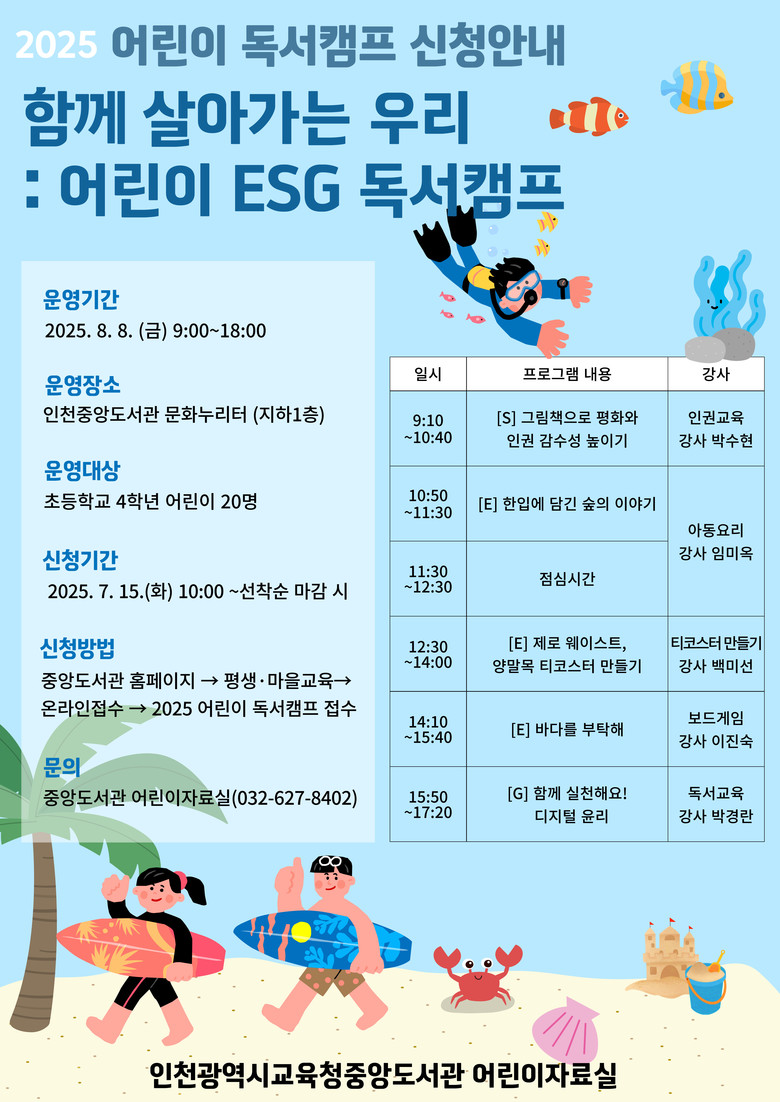 신청은 7월 15일(화) 오전 10시부터 중앙도서관 누리집에서 선착순으로 접수하며, 자세한 사항은 중앙도서관 누리집(https://lib.ice.go.kr/jungang) 또는 어린이자료실(☎032-627-8402)로 문의하면 된다.