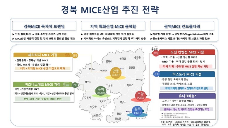 또한 경북만의 특화된 마이스 산업 육성을 위해 관광이벤트를 넘어 지역특화 산업 연계 플랫폼화를 하여 산업-마이스 융복합을 통한 지역경제에 활력을 불어넣는다.