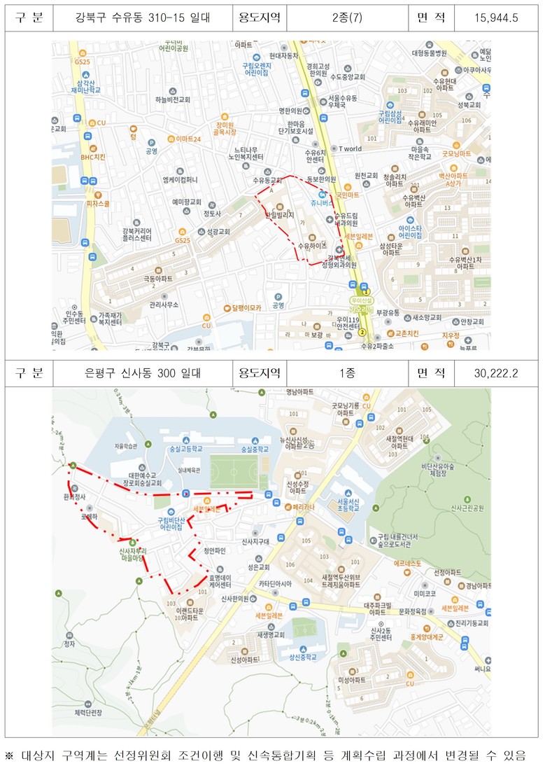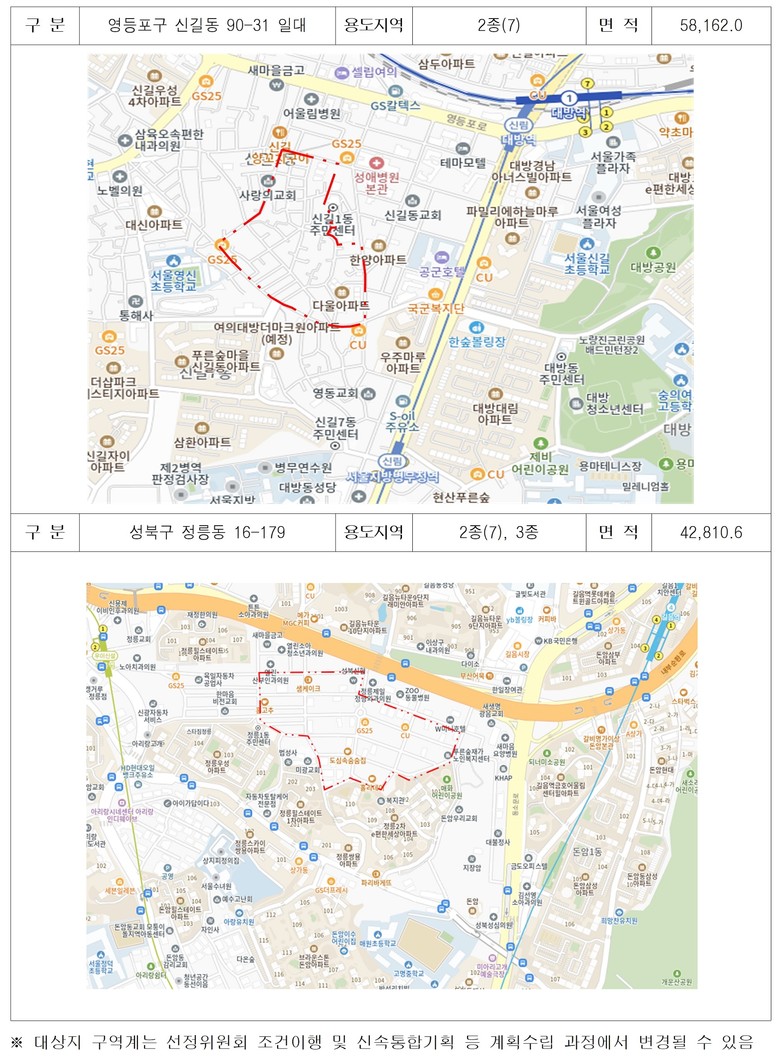 신사동 300번지 일대는 노후도 83%, 반지하주택 비율이 73%에 달하는 노후 저층주거지로 주거환경의 개선이 필요한 지역이며. 독산동 1022번지 일대는 기존에 선정된 재개발사업과 연접한 지역으로 도로 등 기반시설 연계를 통해 주거환경 개선 효과가 클 것으로 기대되며, 신수동 250번지 일대는 70% 이상의 주민이 사업추진에 동의하는 등 주민참여 의지가 높은 지역이다.