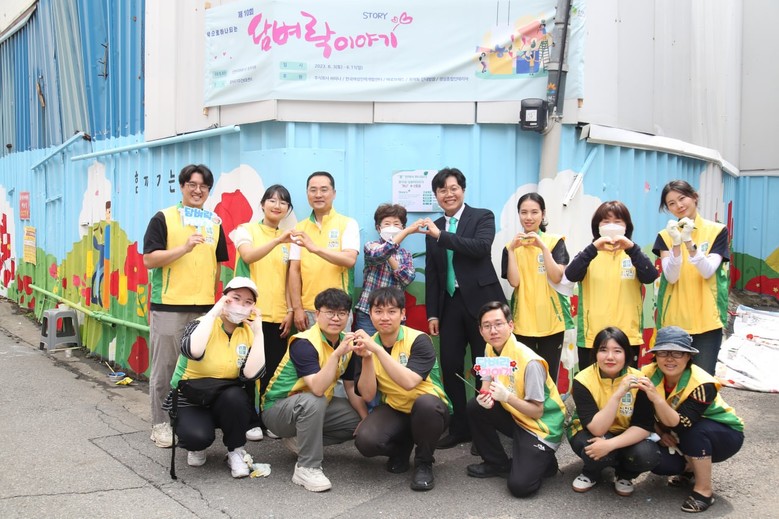 담벼락 이야기는 벽화 봉사로 6월에만 3, 4, 10, 11일 총 4번에 걸쳐 총 85명의 봉사자들이 길이 32m, 높이 2m 거리에 생기를 그렸다.