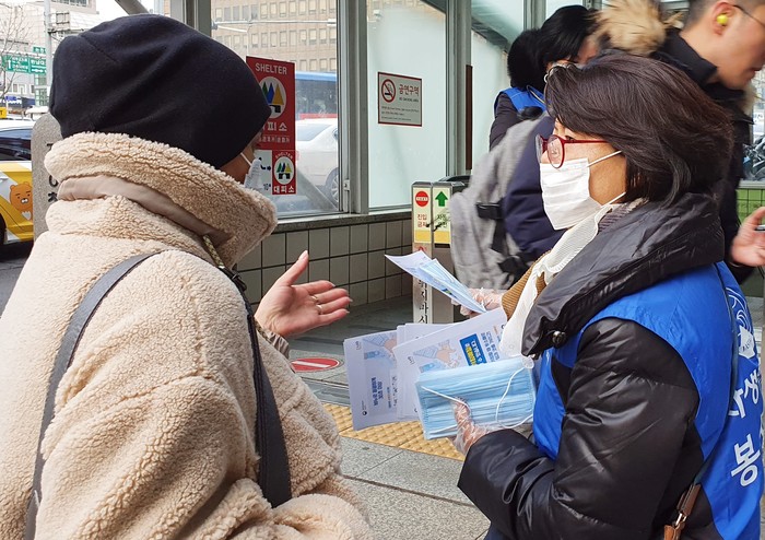 | ▲강남자생봉사단원이 시민에게 마스크를 전달하고 신종 코로나바이러스 감염증 예방법을 설명하고 있다. |