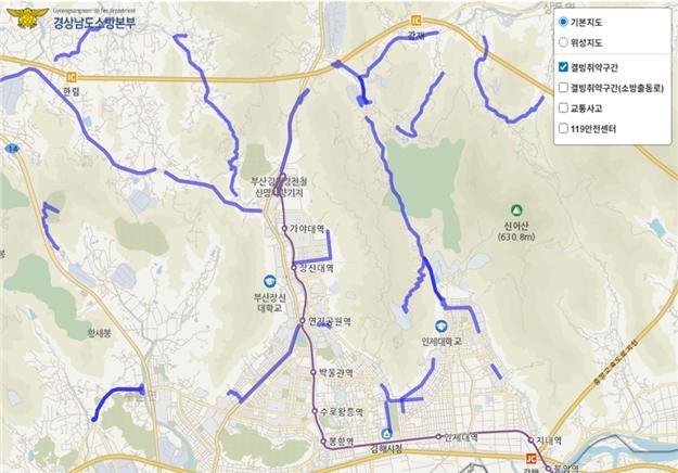 지역별로는 ▲김해시 27개 구간 165건, ▲진주시 8개 구간 35건, ▲합천군 13개 구간 18건 순으로 출동이 많았다. 이들 지역은 하천 인접 도로, 그늘진 곡선 구간, 교량 등 결빙 발생 가능성이 높은 대표적 위험지대로 분석된다.