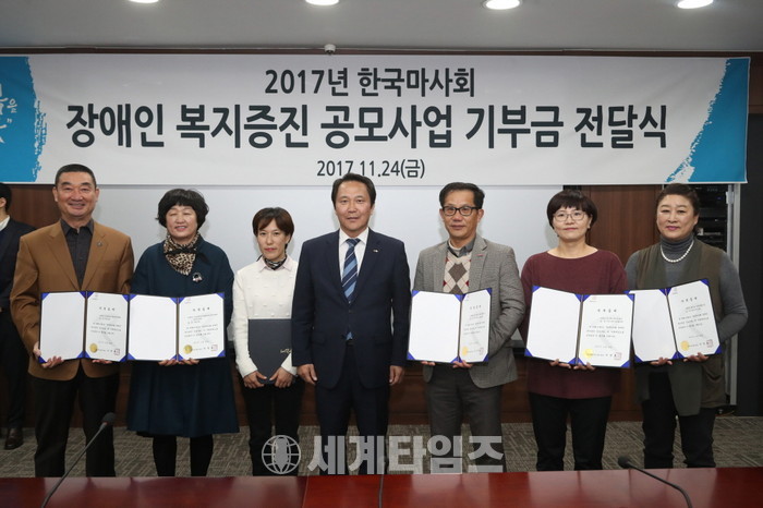 [세계타임즈 신민정 기자]한국마사회는 11월 24일(금) 렛츠런파크 서울(경기도 과천시 소재) 본관에서 ‘2017년 장애인 복지증진 공모사업’ 기부금 전달식을 개최했다. 이번 공모사업에는 230여개 이상의 단체가 지원하여 최종적으로 총 25개소에 기부금 2억 5천만 원이 전달됐다.
