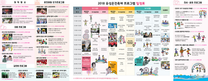 특히 12, 13일 정오 두드림공연장에서는 올해 새롭게 준비한 ‘목욕탕 토크쇼’가 열리며, 웹툰작가 마일로와 개그맨 이홍렬, 전문 세신사 등이 참여해 현장토크쇼 형식의 진행으로 온천축제의 색다른 맛을 즐길 수 있다.