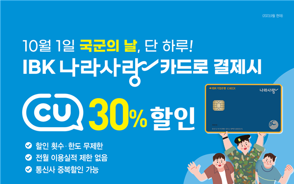 이번 이벤트는 국군의 날 하루 동안 IBK나라사랑카드 보유 고객을 대상으로 CU 편의점에서 이벤트 품목(간편식품, 음료, 아이스크림 등)을 결제하면 30% 현장할인을 제공한다.