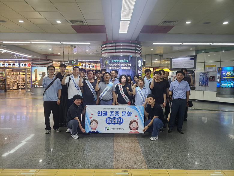 ▸ 인권침해 등 올바른 조직문화 선도 및 인권경영 실천 다짐 [세계타임즈=대구 한윤석 기자] 대구공공시설관리공단(이사장 문기봉)은 7월 2일(수)부터 15일(화)까지 2주간 ‘인권경영 캠페인 주간’으로 지정하고, 전 사업소가 참여하는 인권문화 확산 캠페인을 전개했다.