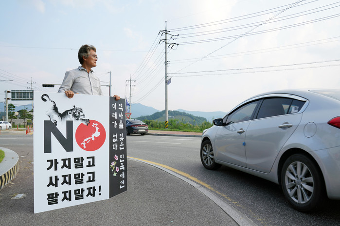 [양구군=세계타임즈 김민석 기자] 신철우 양구군의원이 폭염이 절정에 달하는 6일 송청리 회전교차로에서 일본제품 불매운동 1인 시위를 했다.