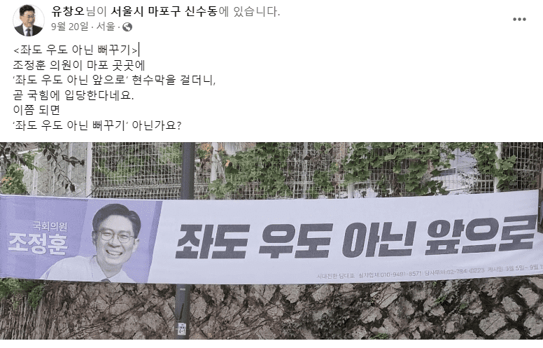 또한 지난 9월 20일에도 조정훈 의원의 ‘좌도 우도 아닌 앞으로’ 현수막을 올리며 국힘 입당에 대해 ‘좌도 우도 아닌 뻐꾸기’라며 글을 올렸다.
