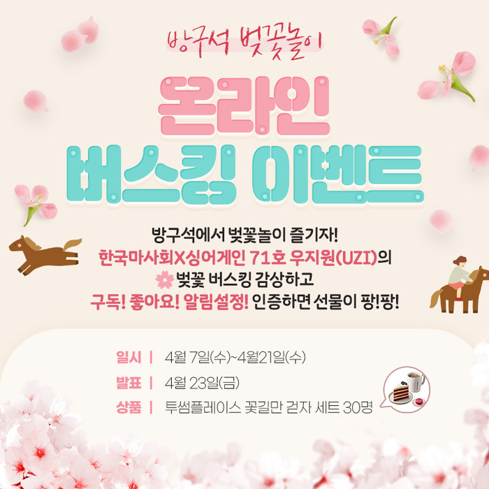 오는 21일까지 ‘마사회TV’ 유튜브 채널을 구독하고 온라인 벚꽃 버스킹 영상 감상 후 ‘좋아요’ 인증하면 이벤트에 참여할 수 있다. 당첨자 발표는 23일이며 추첨을 통해 총 30명에게 디저트와 커피세트 쿠폰을 증정한다. 자세한 사항은 유튜브 ‘마사회TV’ 커뮤니티에서 확인 가능하다.