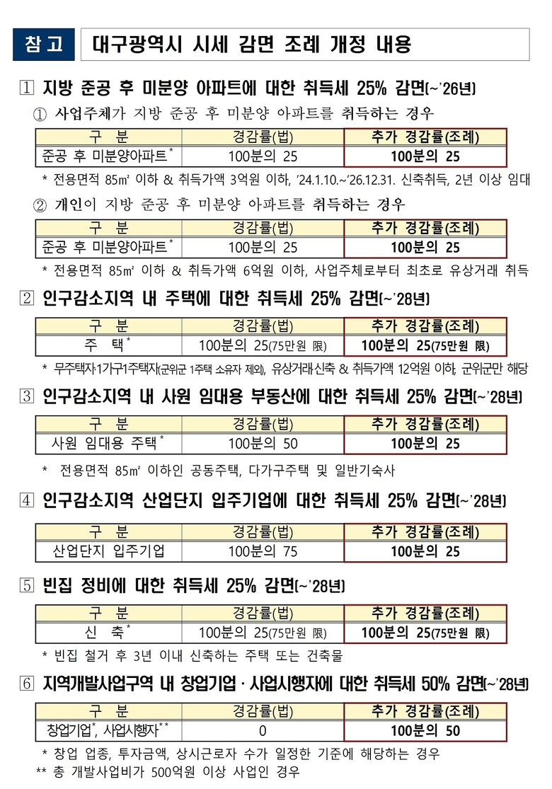 오준혁 대구광역시 기획조정실장은 “이번 조례 개정으로 준공 후 미분양아파트 해소와 인구감소지역 균형발전, 지역 투자 활성화를 동시에 추진할 수 있게 됐다”며 “대구에 거주하고 투자하는 시민과 기업이 실질적인 혜택을 체감할 수 있도록 지속적으로 제도를 보완해 나가겠다”고 말했다.