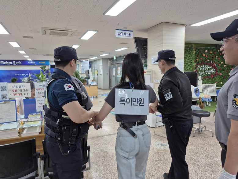 훈련은 실제상황을 가정한 시나리오에 따라 ▲권장 면담 시간 초과, ▲공무원 모욕 및 폭행, ▲진정 요청 및 상담 중단, ▲청원경찰 도움 요청 및 경찰관 호출, ▲피해 공무원 보호 및 방문 민원인 대피, ▲가해 민원인 인계 등의 순서로 진행했다.