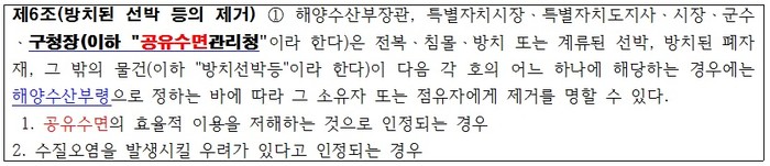 게다가 해운대 구청장이 방치된 선박을 제거하는 것도, 그리 쉽지 않는 상황이다. 공유수면법 제6조(방치된 선박 등의 제거),공유수면관리법 시행령 제3조(방치된 선박 등의 제거)에 따라 방치된 선박에 대해서 처리할 수 있는 근거가 가 있다. 공유수면법 제6조 제3항 제1호 단서에 따르면, “다만, 제거명령을 받은 선박의 이해관계자로부터 제거에 대한 승낙 또는 동의를 받지 못한 경우에는 제외한다”고 규정되어 있다. 다시 말해, 방치된 요트라 할지라도 선박이해관계인(선박등기부에 기재된 자)의 승낙 또는 동의가 없으면 이동 조치를 할 수 없기 때문이다.