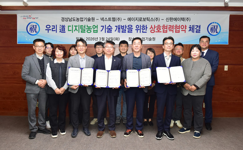 - 공공 연구 인프라와 민간 솔루션 융합... 로봇·인공지능 기반 고유 모델 구축 [세계타임즈=경남 최성룡 기자] 경상남도농업기술원(원장 정찬식)은 24일 농업기술원 회의실에서 신한에이텍(주), 에이지로보틱스(주), 넥스트웹(주)과 ‘경상남도 디지털 농업 기술 공동 개발 및 상호 협력을 위한 업무협약(MOU)’을 체결하고 기술 혁신 거버넌스 구축에 나섰다.