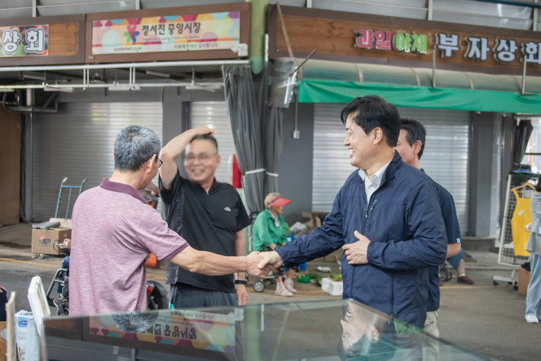 | ▲ 인천 서구 정서진중앙시장에서 소상공인과 담소를 나누는 강범석 구청장 |