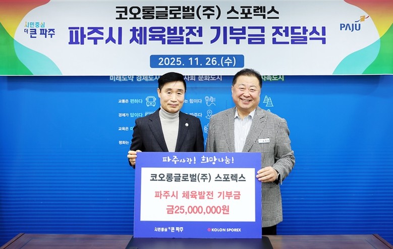 [파주시 세계타임즈=송민수 기자] 파주시는 코오롱글로벌㈜이 지난 26일 파주시 체육 발전을 위한 기부금 2천5백만 원을 전달했다고 밝혔다.
