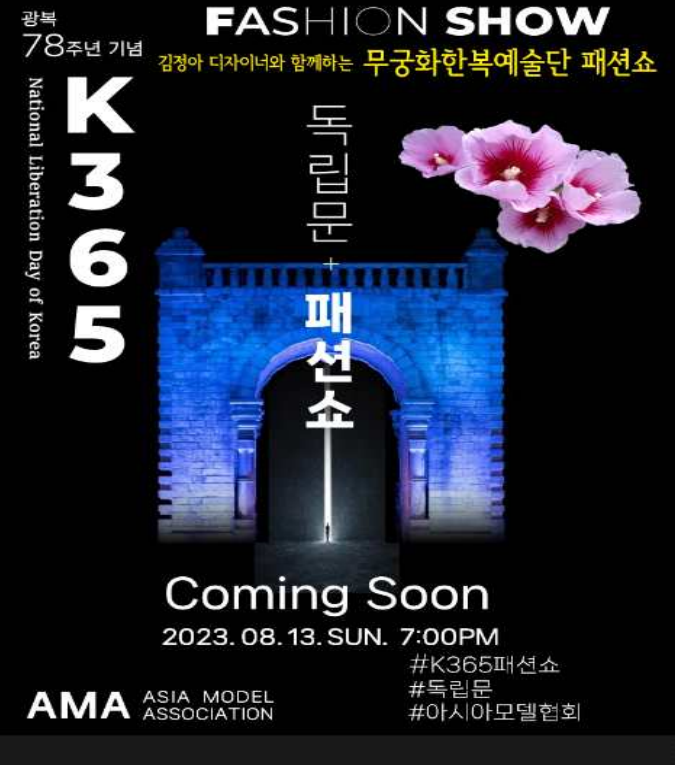 특히, 지난 봄 두바이 초청 패션쇼를 통해 일부만 선보였던 오방색의 무궁화 원삼이 완성되어 우리나라 한복사에 큰 획을 그을 작품으로 광복78주년 기념으로 K365패션쇼에 참가하는 모델들과 무궁화한복에술단의 한복 모델들이 펼치는 독립문의 아름다운 밤이 기대되는 패션쇼이다
