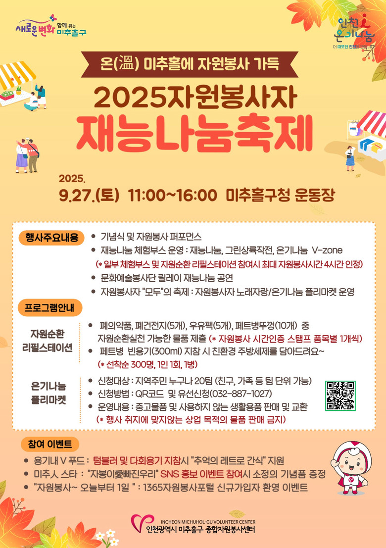 특히, 센터는 올해 특별 이벤트로 ‘미추홀구 소속 등록자 10만 번째 자원봉사자를 찾아라!’ 부스를 운영해 기념 이벤트와 다양한 혜택을 제공하며, 참여자들에게 색다른 즐거움을 선사할 계획이다.