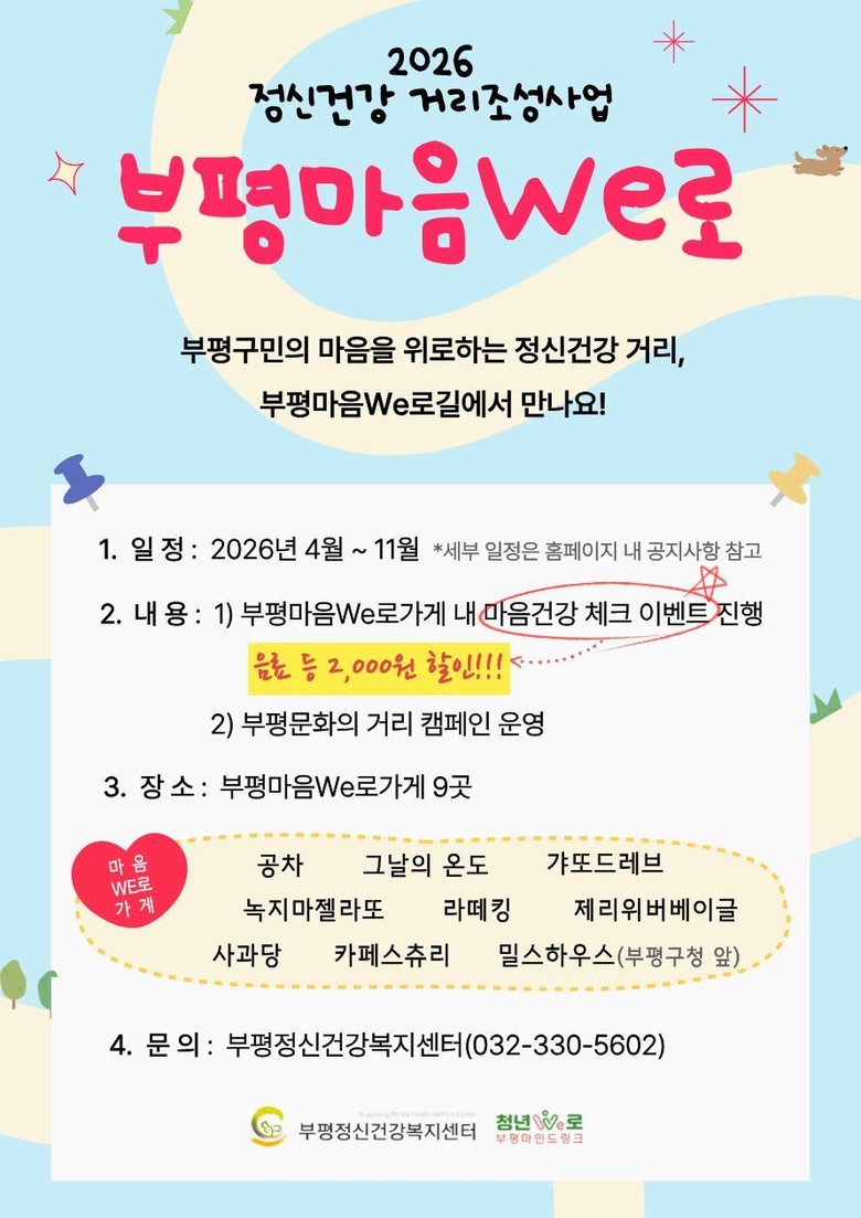참여자에게는 음료 2천 원 할인 혜택이 제공되며, 자세한 내용 및 사업 관련 문의는 부평정신건강복지센터 누리집 또는 전화(☎032-330-5602~3)를 통해 확인할 수 있다.