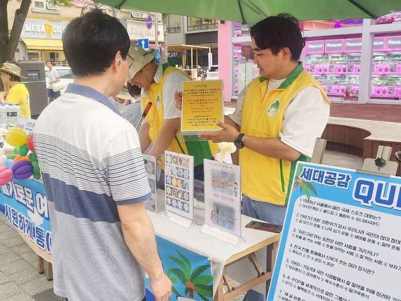 | ▲ 지난 23일 김포시 장기동 시계탑 앞에서 언어소통 캠페인 퀴즈존에 참여하고 있는 시민의 모습 [사진 제공 = 신천지자원봉사단 김포지부] |
