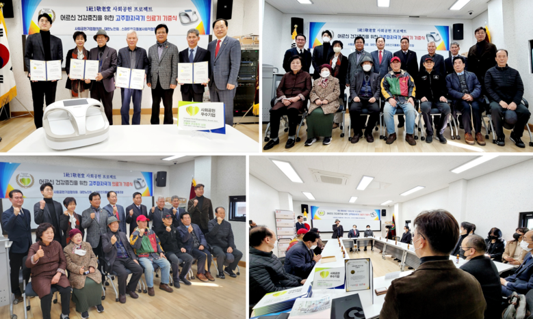 [세계타임즈 백진욱 기자] 현재 시대적인 트랜드이자 기업경영의 대두가 되고 있는 ESG경영의 Social(사회)부문에 사회공헌의 뜻을 같이하기 위해 관악농협, 금천신용협동조합, 세무법인 이레, 어의명가㈜, 한국치매예방강사협회, 진성요양보호사교육원 등 금융, 세무, 유통, 교육 등 각 분야의 기업과 단체가 하나가 되어 ESG 1+1 사회공헌 프로젝트 ‘1사 1경로당 의료기 기증 사업‘ 에 동참하고 나섰다.