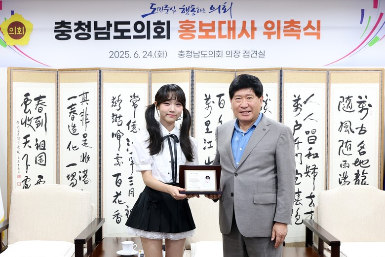 도의회는 24일 의회 접견실에서 홍성현 의장(천안1‧국민의힘)과 교육위원회 이상근 위원장(홍성1‧국민의힘), 지민규 의원(아산6·무소속), 의회사무처 간부 공무원 등이 참석한 가운데 홍보대사 위촉식을 개최했다.