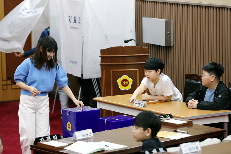 참석 학생들은 무기명 투표를 통해 청소년 의장을 선출하고 ‘안전한 실내화 착용의 의무화 조례안’과 ‘지역 어린이 병원 의무화 건의안’, ‘학교 밖 복도 신발장 배치 건의안’ 등 세 건의 안건을 심의‧의결했다.