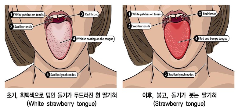 특히 혀가 붉어지고 돌기가 부어오르는 ‘딸기혀’ 증상이 특징적이다.