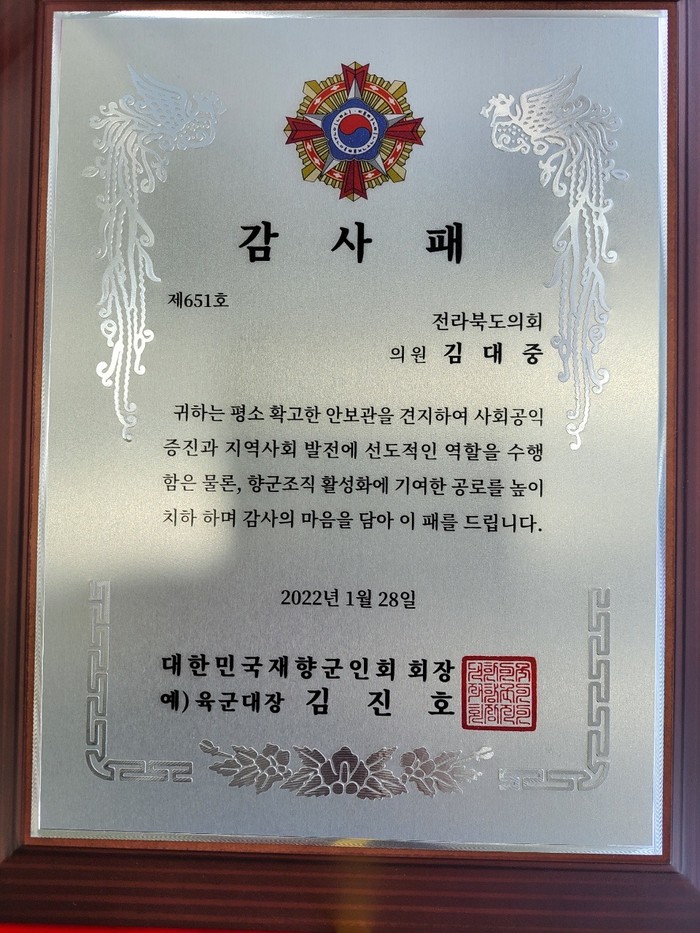 [전북=세계타임즈 김동현 기자] 전라북도의회 김대중 의원(행정자치위원회, 정읍2)이 대한민국재향군인회(회장 김진호)로부터 감사패를 수상했다.