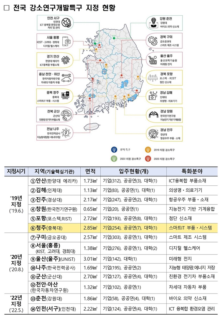 충북은 2019년 충북대 및 오창과학산단 등 강소연구개발특구(2.85㎢)가 지정되어 스마트 IT 부품·시스템 특화분야를 중심으로 연구개발 및 기술창업, 사업화 등 우수한 성과를 창출하고 있다.
