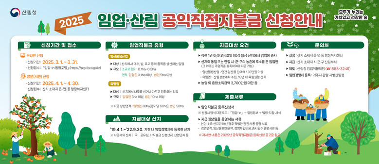 [경북 세계타임즈=한윤석 기자] 경상북도는 2025년 임업‧산림 공익직접지불금(이하‘임업 직불금’) 신청접수를 3월 1일부터 4월 30일까지 실시한다.