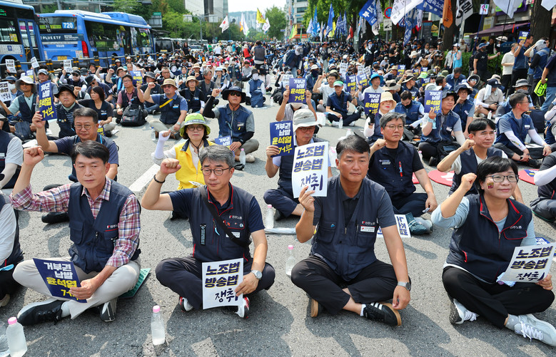 [세계타임즈 = 이장성 기자] 17일 오후 서울 광화문역 인근에서 열린노조법·방송법 쟁취! 8.17 거부권 거부 범국민 대회에서 참가자들이 구호를 외치고 있다. 2024.8.17