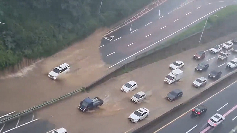 수도권 곳곳에 폭우가 내린 17일 오전 경기도 구리시 동구릉 인근 북부간선도로 일부 구간이 폭우로 침수돼 차량 운전자들이 서행 운전을 하고 있다.[연합뉴스제공]