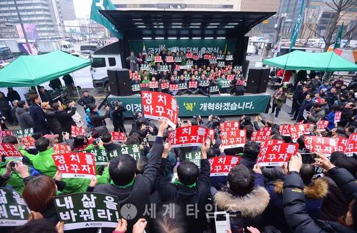 국민의당 박지원 대표와 주승용 원내대표, 안철수 전 공동대표 등 당원들이 4일 서울 종로구 세종문화회관 계단에서 열린 국가대개혁위원회 출정식에서 구호를 외치고 있다. 2017.02.04