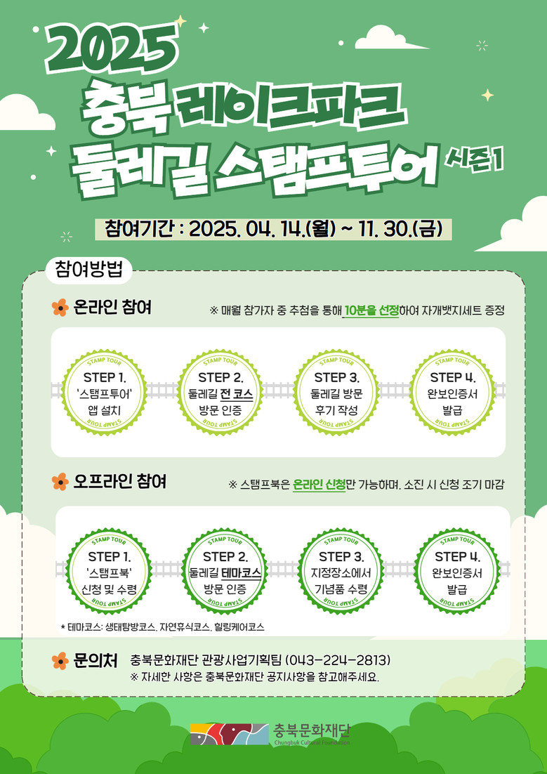 충북문화재단에 따르면, 지난해 스탬프투어에는 6개월 간 약 2,800명이 참가하며 프로그램의 인기를 입증했다. 특히 올해는 온라인 참여 방식을 추가해 접근성과 참여도를 한층 높인 점이 특징이다.