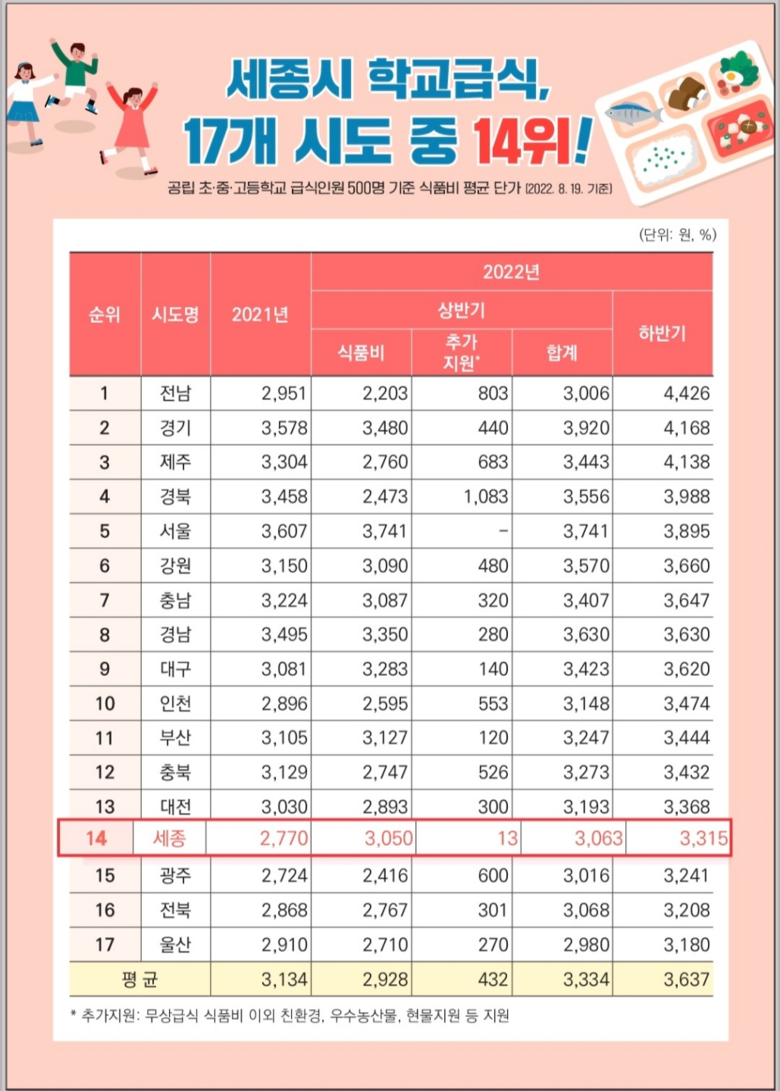 김효숙 의원은 교육청 교육행정국을 대상으로 “지난 추경을 통해 세종교육청 급식 지원금액을 증액한 것인데도 2022학년도 하반기 시도별 급식비를 살펴보면, 17개 시도 중 최하위권에 속하는 14위(3,315원)에 불과하다”며 “전남은 4,426원으로 세종과 1,000원 넘게 차이나며 경기도(4,168원)와 제주도(4,168원)도 4,000원을 넘어섰다”고 지적했다.
