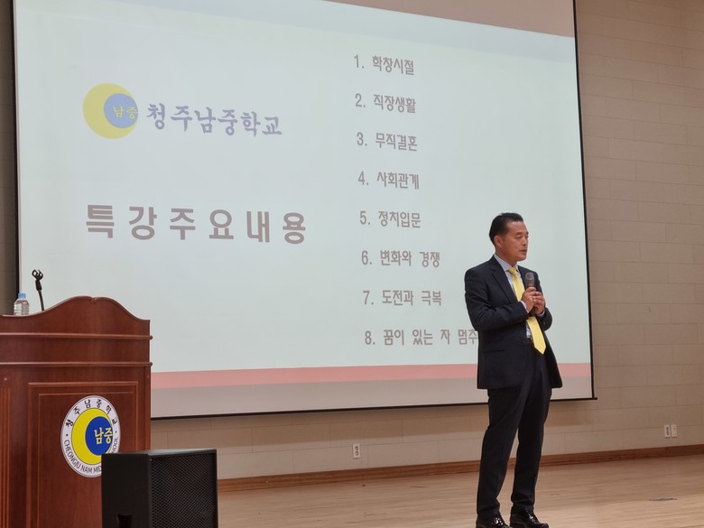 [충북 세계타임즈=이현진 기자] 박지헌 충북도의회 예산결산특별위원회 위원장은 23일(수) 오전 10시 30분 모교 청주남중학교(교장 김수희) 청남관에서 학생들을 대상으로 90분간 꿈과 희망을 심어주기 위해 '동문 선배 명사 초청 특강'을 실시했다.
