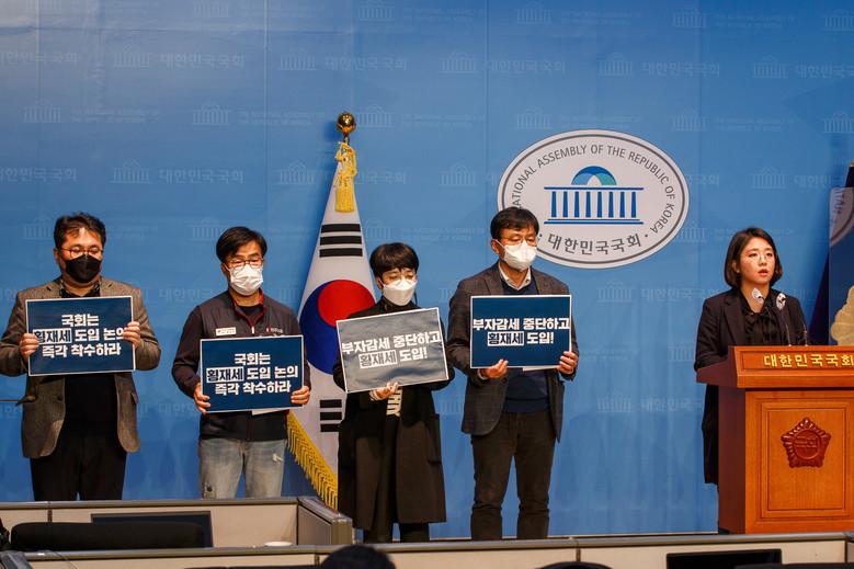 이날 기자회견에는 나원준 경북대 경제통상학부 교수, 한성규 민주노총 부위원장 겸 재벌특위원장, 김은정 참여연대 협동사무처장, 정태흥 진보당 공동대표, 용혜인 기본소득당 국회의원이 횡재세 지지 발언을 했다.