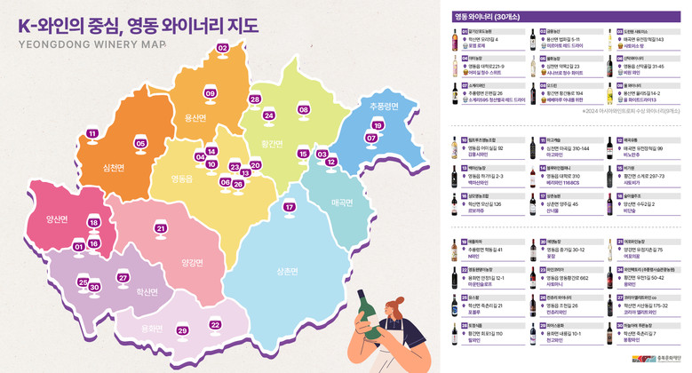 그중 대전컨벤션센터(DCC)에서 개최된 <2024 아시아와인트로피>에서 세계 33개국 3,500여 점의 와인을 제치고 수상의 영예를 얻은 영동 와이너리 9곳을 소개하고자 한다. 충청북도 여행 시, 자신에게 맞는 와인 취향을 찾아가는 소소한 재미를 느껴보시길 바란다.