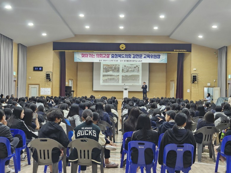 이날 김현문 교육위원장(청주14)은 청주중앙여자중학교(교장 김종순)를 방문해 2~3학년 220여 명을 대상으로 △조례 제·개정 및 폐지 △예산 심의와 결산 승인 △대집행기관 질문 △5분 자유발언 등 의회에서 하는 다소 생소한 일들을 알기 쉽게 설명하며 학생들의 이해를 도왔다.