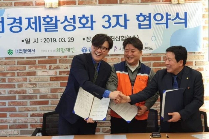 [세계타임즈 이장성 기자] SNS 대전시 봉사단체 (사)사랑의 사다리 밴드는 29일 오전11시 점진신협 3층에서 대전소상공인 살려 이웃사랑을 함께 실천하기 위해서 점진신협(이사장 신현학), (재)중소상공인희망재단(이사장 이윤재)과 대전경제활성화를 위한 3자 업무협약(MOU)을 체결했다.