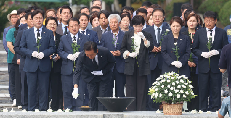 더불어민주당 정청래 대표가 7일 오전 경남 김해시 진영읍 봉하마을을 방문, 노무현 전 대통령 묘역을 참배하며 헌화하고 있다. 2025.8.7