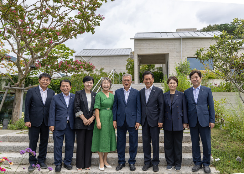 더불어민주당 정청래 대표가 7일 경남 양산시 하북면 평산마을 문재인 전 대통령 사저에서 문 전 대통령을 예방, 기념촬영을 하고 있다. 2025.8.7 [더불어민주당 제공]