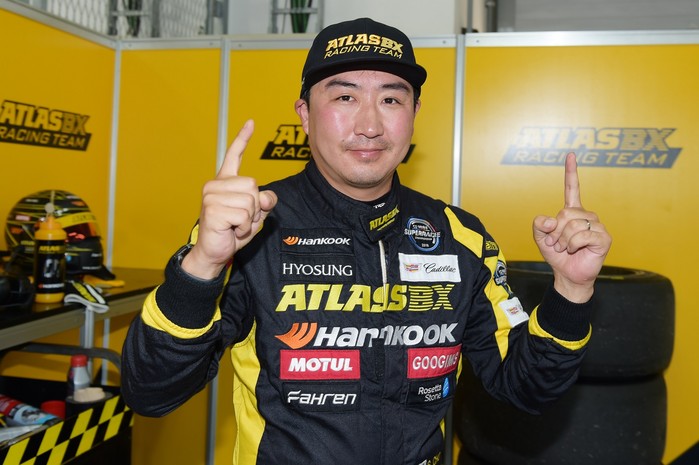 [사진설명] 아트라스BX 레이싱팀의 조항우가 8일 영암 코리아 인터내셔널 서킷에서 열린 2018 CJ대한통운 슈퍼레이스 챔피언십 6라운드 캐딜락 6000 클래스 예선에서 1위를 차지한 뒤 손가락을 치켜들며 기뻐하고 있다.
