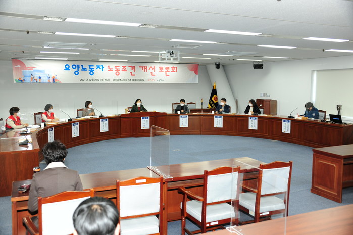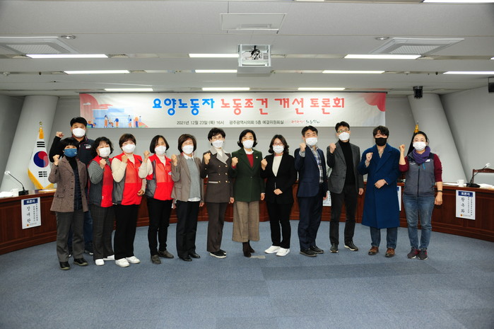 ‘요양노동자 노동조건 개선 및 보호방안 정책토론회’가 23일 오후 4시 광주광역시의회 5층 예산결산특별위원회실에서 열렸다. 이날 토론회는 광주광역시의회 환경복지위원장 신수정 의원(더불어민주당.북구3)을 좌장으로 최경미 광주광역시노동센터장이 ‘광주 요양보호노동자 노동조건 및 건강실태조사’ 결과를 발표하고, 김정엽 국민입법센터 연구기획팀장이 ‘돌봄노동자 기본법 제정의 필요성’에 관한 발제가 있었다. 토론자로는 박선화 전국요양서비스노동조합 광주지부장, 장애란 전국요양서비스노동조합 북구2지회장, 황옥화 한국노인장기요양기관협회 광주지부장, 신일영 광주재가장기요양기관연합회 사무처장, 전은옥 광주광역시 고령사회정책과장이 참여하였다.