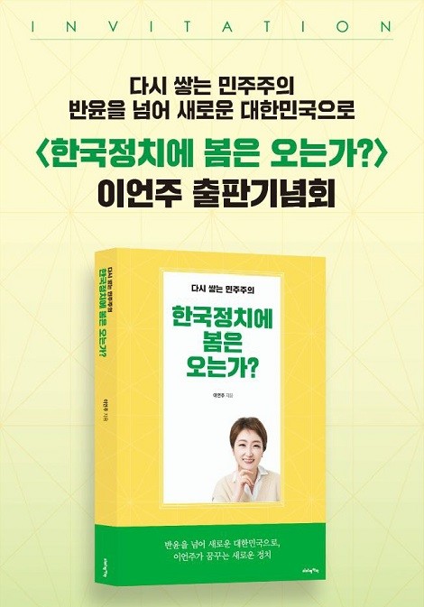 이언주는 "이번 출판기념회를 통해 한국 정치에 활력과 변화를 불러오기를 기대하는 국민분들과 소통하길 원한다. 이 책에는 분명 '민주주의를 다시 쌓을 답'이 있다"라고 전했다.