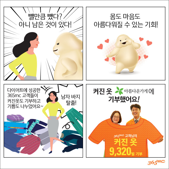 비만클리닉 365mc는 '커진 옷 기부 캠페인'을 진행해 총 9320벌의 기부품을 사회적기업 아름다운가게에 기부했다고 밝혔다.
