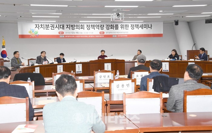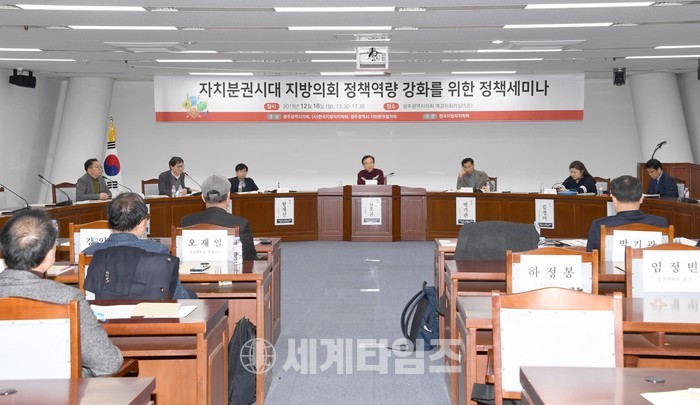 [광주의회=세계타임즈 손권일 기자] 광주광역시의회(의장 김동찬)는 12월 16일 오후 1시 30분에 시의회 5층 예산결산특별위원회 회의실에서 "자치분권시대 지방의회 정책역량 강화를 위한 정책세미나"를 주제로 토론회를 가졌다.