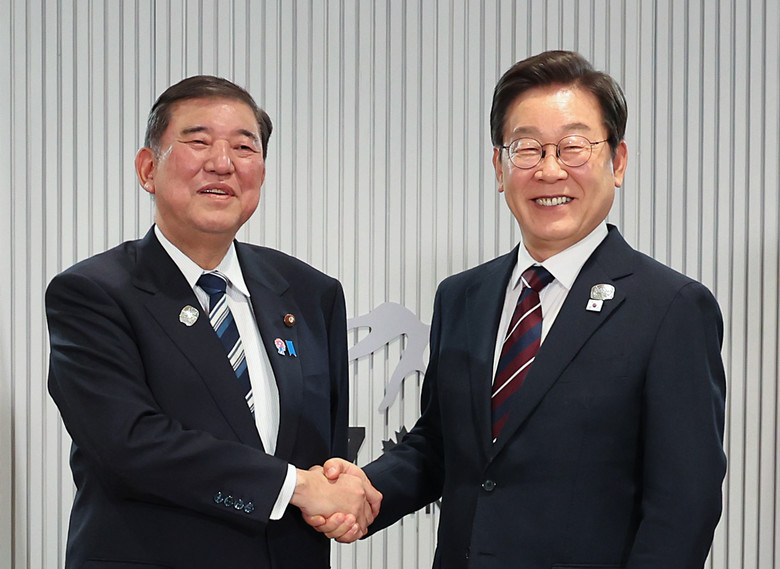 이재명 대통령이 17일(현지시간) 캐나다 앨버타주 캐내내스키스 주요 7개국(G7) 정상회의장에서 열린 한일 정상회담에서 이시바 시게루 일본 총리와 악수하며 기념촬영을 하고 있다. 2025.6.18