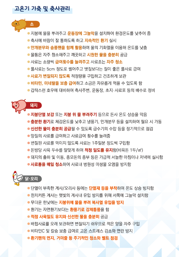 이와 함께, 가축 폭염 피해 최소화하기 위해 시군 및 언론 등을 통해 관리요령과 현장 컨설팅 내용을 문자 발송, 현수막 게시, SNS 등을 활용한 다각적으로 추진한다.