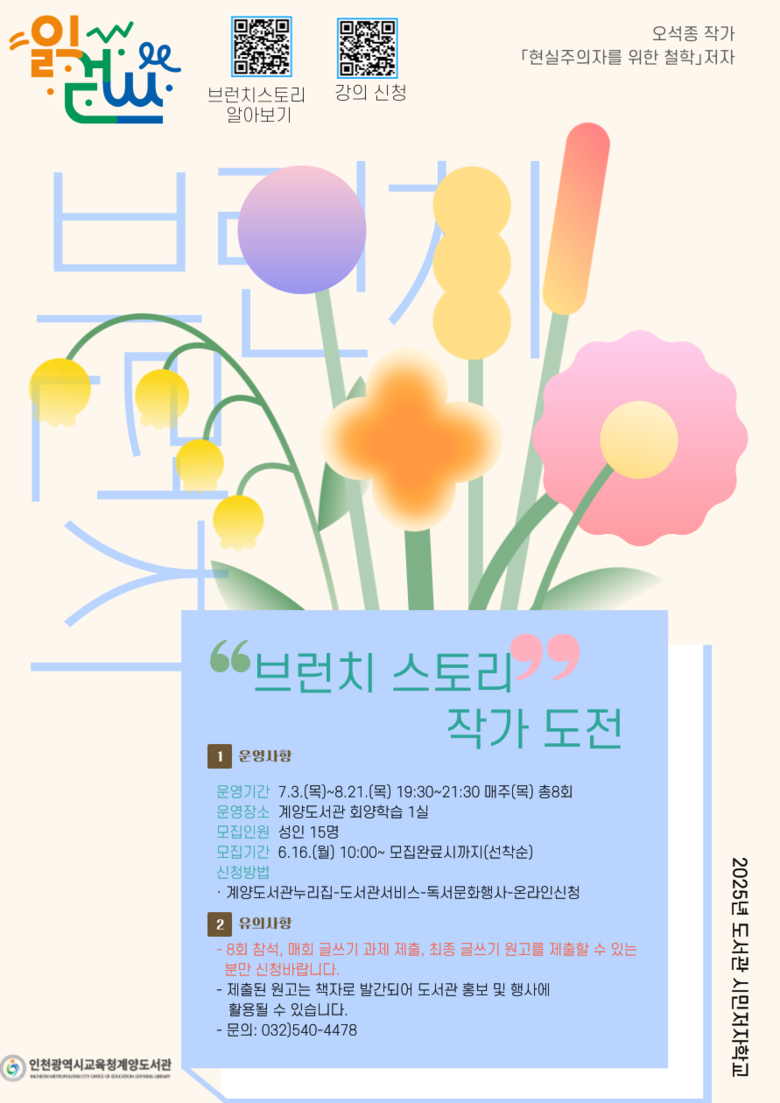 참가 신청은 6월 16일 오전 10시부터 계양도서관 누리집(도서관서비스 > 독서문화행사 > 온라인신청)에서 선착순으로 가능하다.